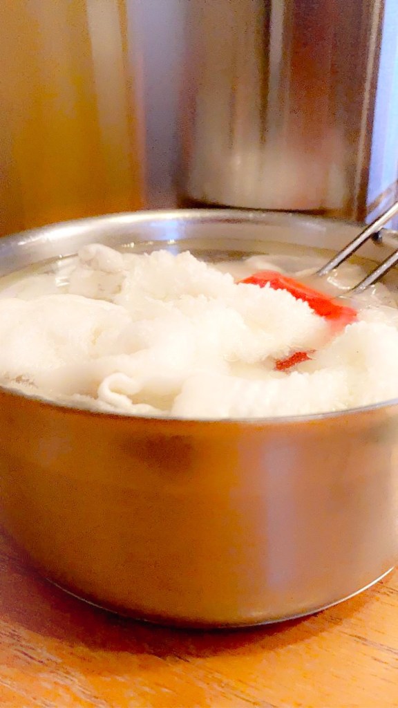 First, pour boiling water over the wipes in a pan for sterilisation, leave to soak for a few minutes then drain. Top the pan back up with distilled water & gently warm.