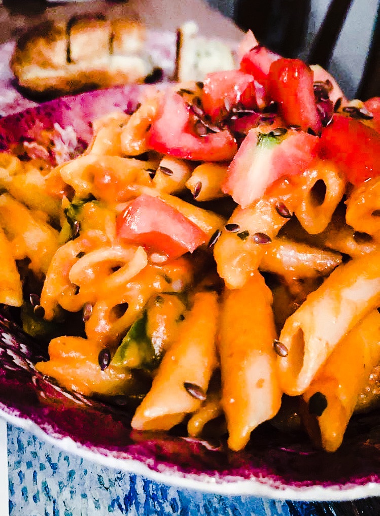 Pasta pan & freezer portions. Put the garlic bread in the oven, boil & drain pasta. Add chopped pepper to pasta & lightly steam for a few minutes. Add pasta sauce & heat gently. When the garlic bread is ready, transfer to serving bowls & top with chopped tomato & flax seed.